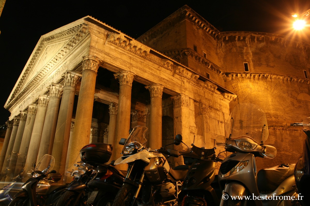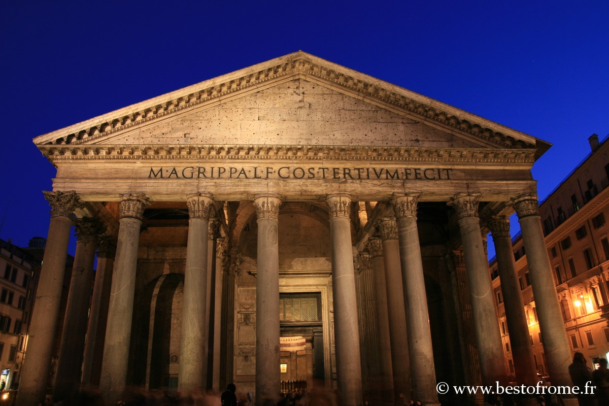 Le Panthéon est un temple dédié aux dieux païens des romains, à Mars et à Vénus en particulier, qui furent les protecteurs de la Gens Iulia (la famille de Jules César). Il fut reconstruit entre l’an 118 et 125 de notre ère par l’empereur Hadrien pour remplacer l’ancien temple érigé à l’initiative d’Agrippa vers – 27 avant J.-C et qui brûla en 80 après J.-C. A l’occasion des derniers travaux, fut élevée à 43 mètres de hauteur la grande coupole à caissons, percée d’un oculus.